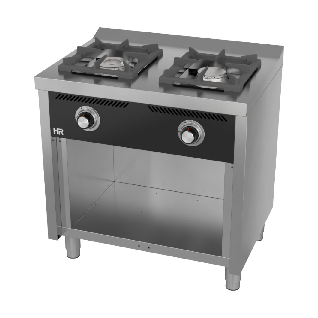 ocina profesional de pie con dos fuegos a gas y estante inferior, diseñada para cocinas de hostelería que requieren un equipo compacto, funcional y eficiente.