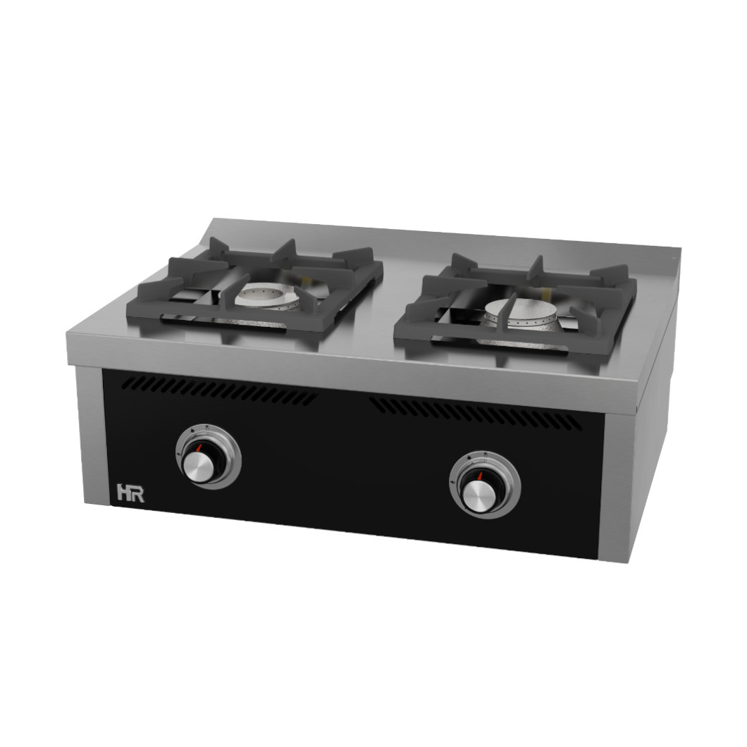 Cocina profesional de sobremesa de la marca HR Fainca, equipada con dos fuegos a gas, diseñada para cocinas de hostelería que requieren eficiencia y potencia en un formato compacto.