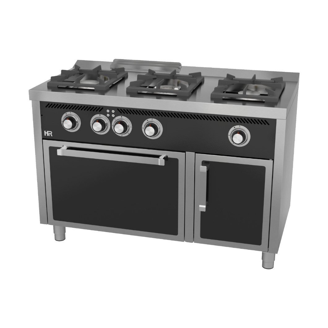 Dispone de tres quemadores de alta potencia y un horno eléctrico de 3,5 kW, proporcionando una potencia total de 22,10 kW, adecuada para servicios continuos y exigentes. Su estructura está pensada para garantizar durabilidad, estabilidad y facilidad de limpieza en entornos profesionales.
