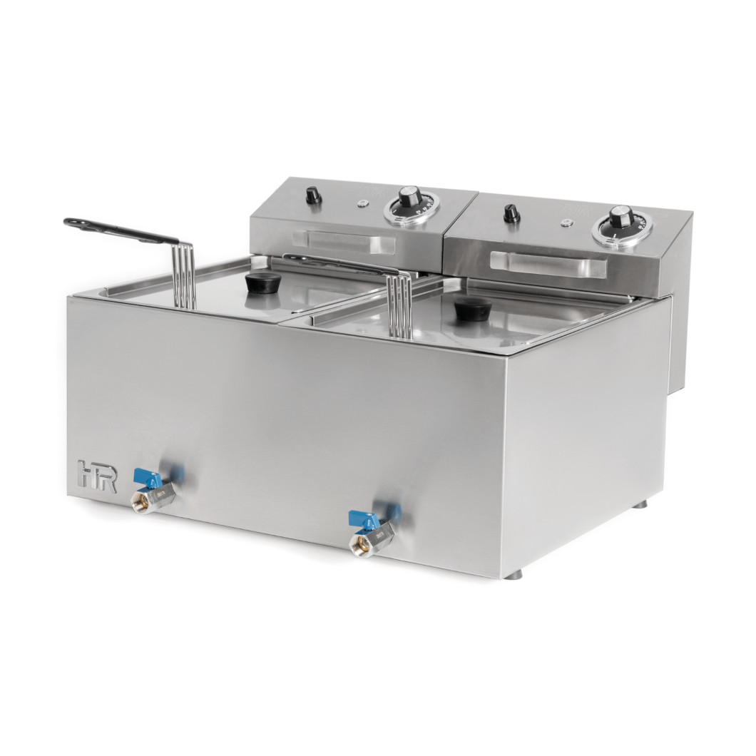 La freidora eléctrica profesional HR FAINCA de 10 + 10 litros con grifo está diseñada para ofrecer un equilibrio óptimo entre potencia, eficiencia y versatilidad en cocinas profesionales. Sus dos cubas independientes de 10 litros permiten freír distintos alimentos de forma simultánea sin mezclar sabores, optimizando los tiempos de producción y mejorando el rendimiento en servicios intensivos.