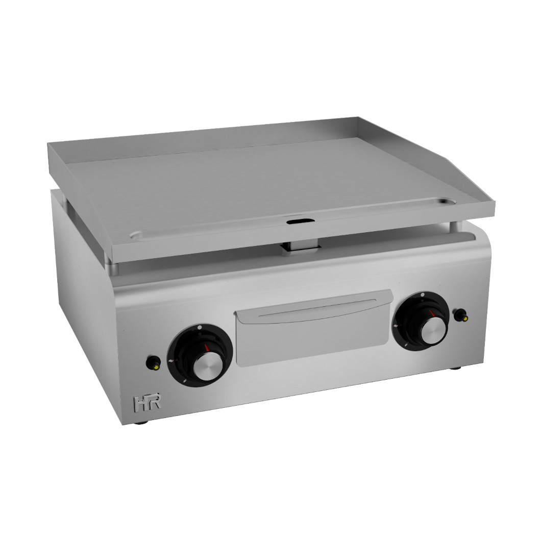 Plancha de gas profesional para hostelería de la marca HR FAINCA, fabricada con superficie de cocción lisa en acero rectificado, ideal para cocinas industriales, bares, restaurantes y hoteles que buscan precisión, durabilidad y alto rendimiento. El acero rectificado proporciona una distribución homogénea del calor, excelente inercia térmica y resultados constantes en todo tipo de preparaciones.