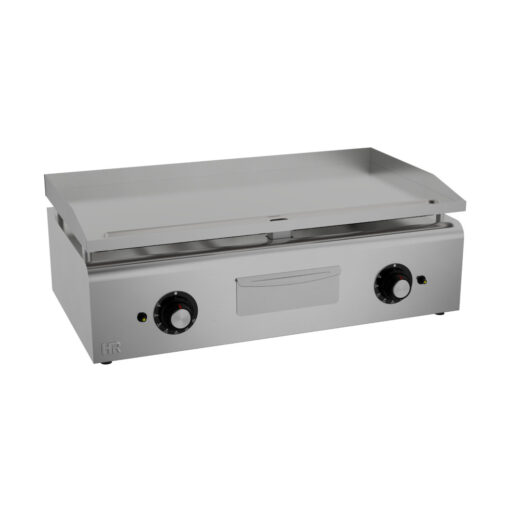 Plancha profesional de gas de la marca HR FAINCA, con superficie de cocción cromada lisa, ideal para cocinas de hostelería que buscan máxima higiene, rapidez y facilidad de mantenimiento. El acabado en cromo duro ofrece una excelente distribución del calor, evita la adherencia de los alimentos y permite una limpieza más rápida y eficiente.