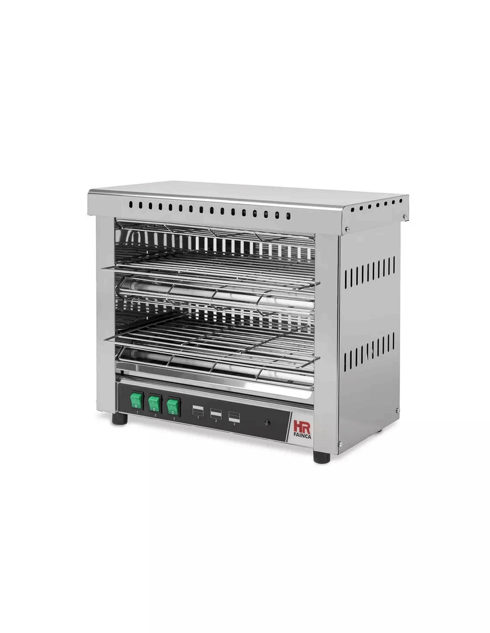 Este modelo está equipado con resistencias blindadas, lo que asegura un calentamiento rápido y uniforme, además de ofrecer una mayor seguridad y protección frente a la acumulación de residuos o contacto directo con los alimentos. Al no contar con temporizador, el control del tiempo de tostado queda completamente en manos del operario, permitiendo un manejo personalizado y adaptado a cada necesidad.