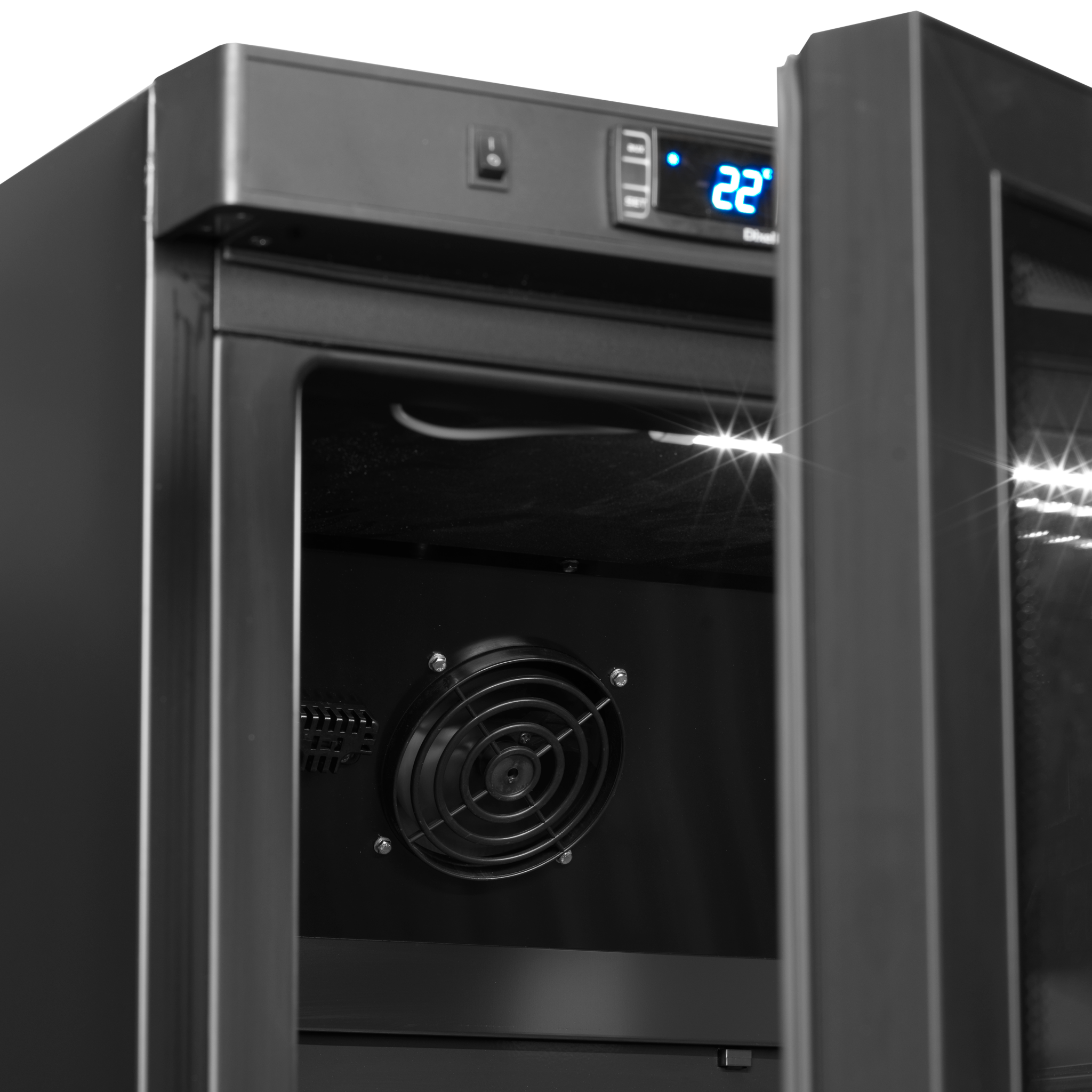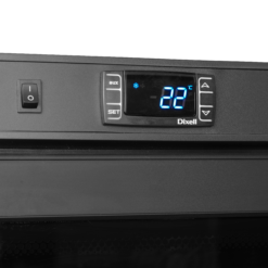 Interior y exterior negro|Estantes ajustables GN2/1|Puerta reversible de cristal|Refrigeración asistida por ventilador|Control digital e indicador de temperatura|Luz interior LED|Patas ajustables con ruedas en la parte trasera|Cierre