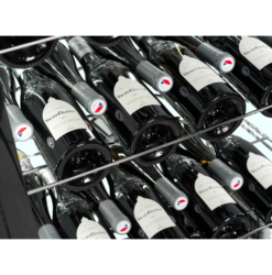 Cristal doble en los cuatro costados|Puerta de cristal sin marco|Excelente presentación del producto|Luz LED interna|Exterior negro|Acero inoxidable interior efecto espejo|Estantes de cristal|Refrigeración forzada|Estantes para vino disponibles como opción