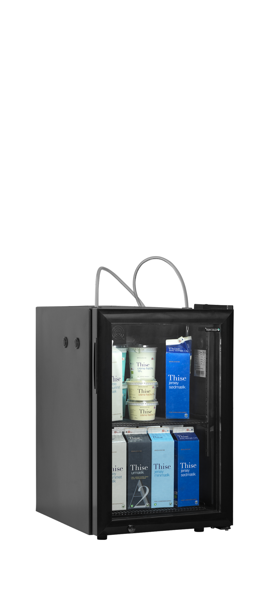 Ideal como refrigerador de leche para máquinas de café|Refrigerador de encimera con orificios, casquillos y conectores|6 orificios: 2 en la parte superior y 2 en cada lado|Puerta batiente de cristal|Patas regulables|Refrigeración asistida por ventilador|Luz interior LED|Tubos dispensadores no incluidos