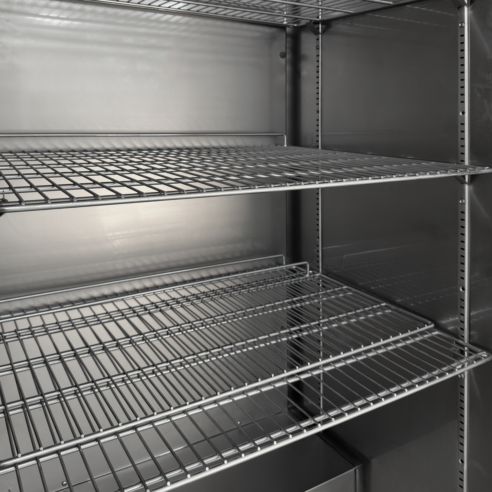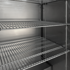 Exterior e interior de acero inoxidable|Estantes ajustables GN2/1|Refrigeración forzada|Tirador integrado|Puerta maciza reversible|Control digital e indicador de temperatura|Patas ajustables con ruedas en la parte trasera|Cierre