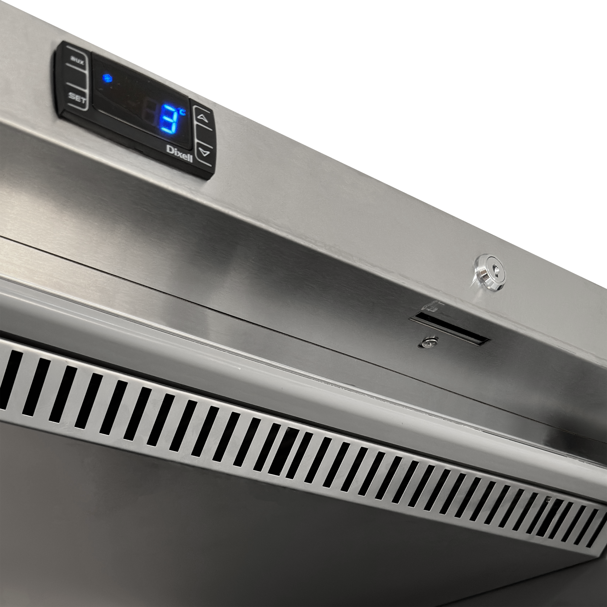 Exterior e interior de acero inoxidable|Estantes ajustables GN2/1|Excelente eficiencia energética|Refrigeración asistida por ventilador|Tirador integrado|Puerta maciza reversible|Control digital e indicador de temperatura|Patas ajustables con ruedas en la parte trasera|Cierre