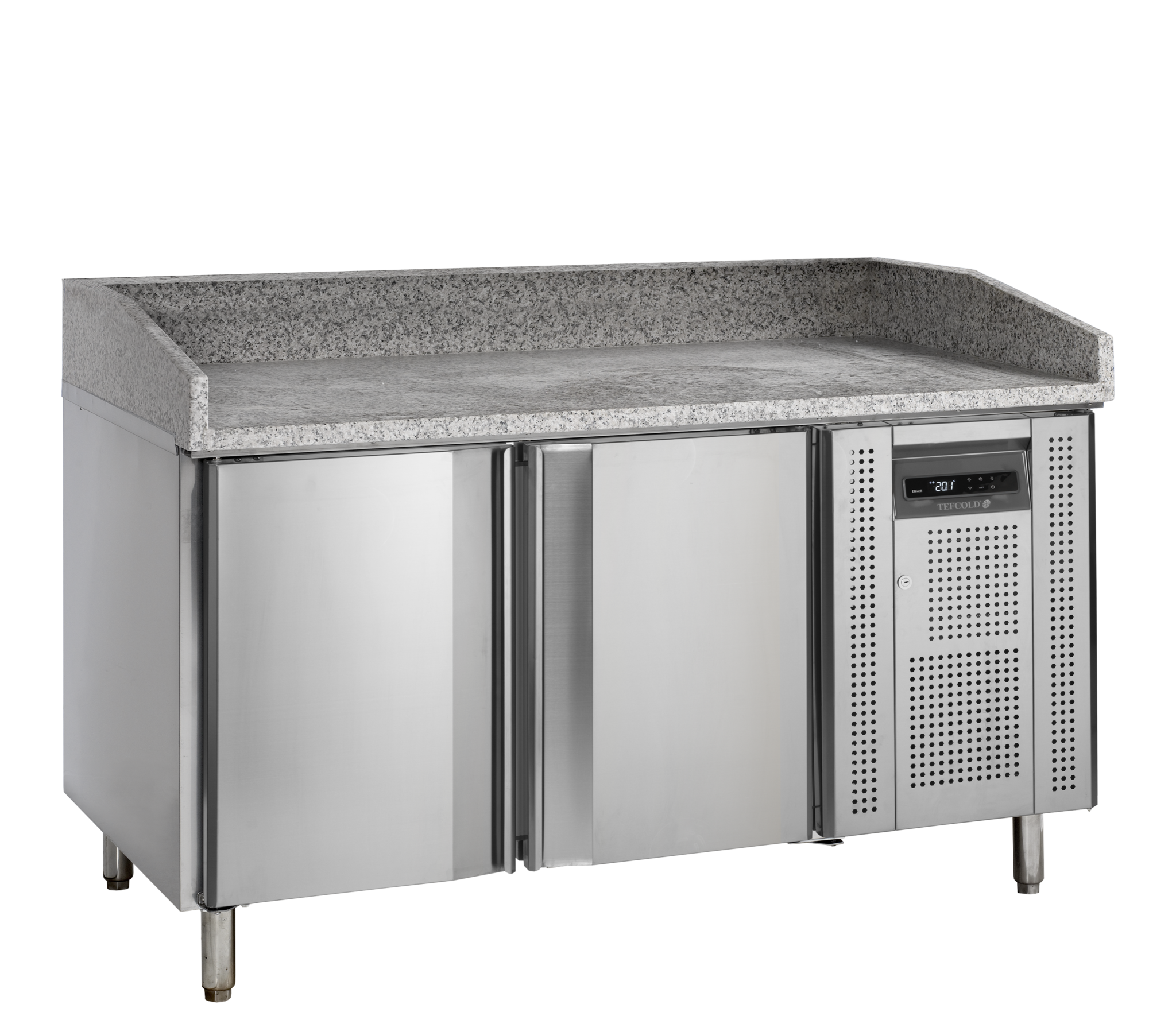 Nuevo diseño|Acero inoxidable|Guías para 7 bandejas de pizza en cada puerta (400×600 mm)|Encimera de granito|Descongelación automática|Puertas de cierre automático|Refrigeración forzada