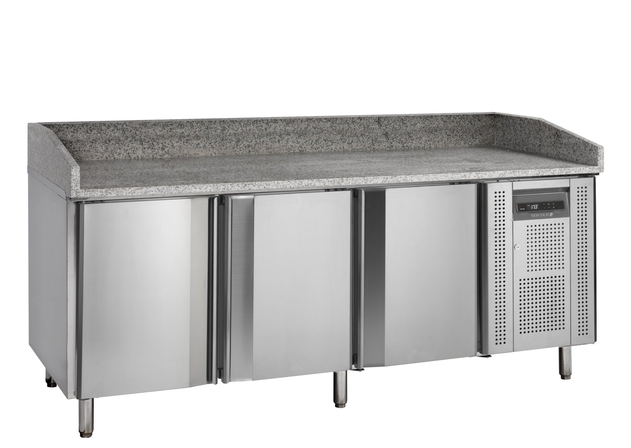 Nuevo diseño|Acero inoxidable|Guías para 7 bandejas de pizza en cada puerta (400×600 mm)|Encimera de granito|Refrigeración forzada|Descongelación automática|Puertas de cierre automático|Patas regulables
