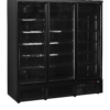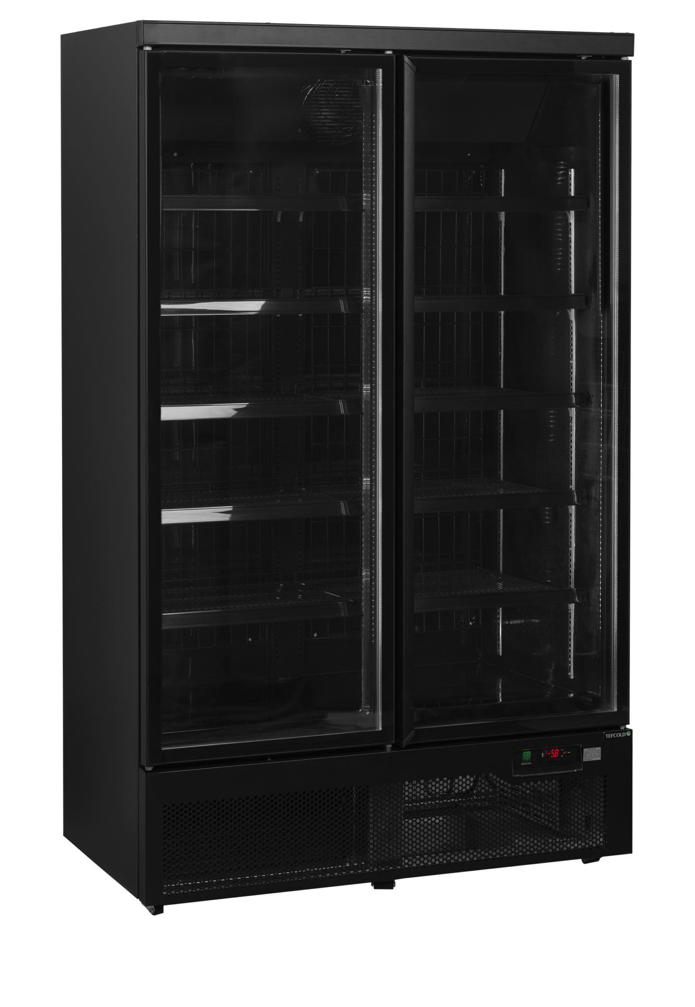 Perfecta exposición de alimentos congelados|Interior y exterior negro|Bajo consumo de energía|Puertas de cristal térmico de cierre automático|Triple acristalamiento aislante|Estantes ajustables detrás de cada puerta|Refrigeración forzada|Luz vertical interna LED|Base de acero inoxidable con efecto espejo|Control digital e indicador de temperatura|Disponible opción de abatidor