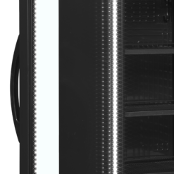 Puerta de cristal con bisagra a izquierda|Interior y exterior negro|Diseño elegante|Excelente presentación del producto|Espacio para estante adicional|Luz LED en marco de puerta|Estantes ajustables|Refrigeración asistida por ventilador