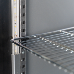 Excelente presentación del producto|Bajo consumo de energía|Revestimiento exterior/interior |Idóneo para la personalización con la marca|Puerta reversible de cristal|Estantes ajustables de rejilla|Luz interior LED con interruptor|Patas regulables|Control digital e indicador de temperatura|Descongelación automática|Marco móvil disponible como accesorio