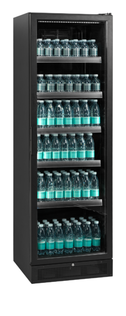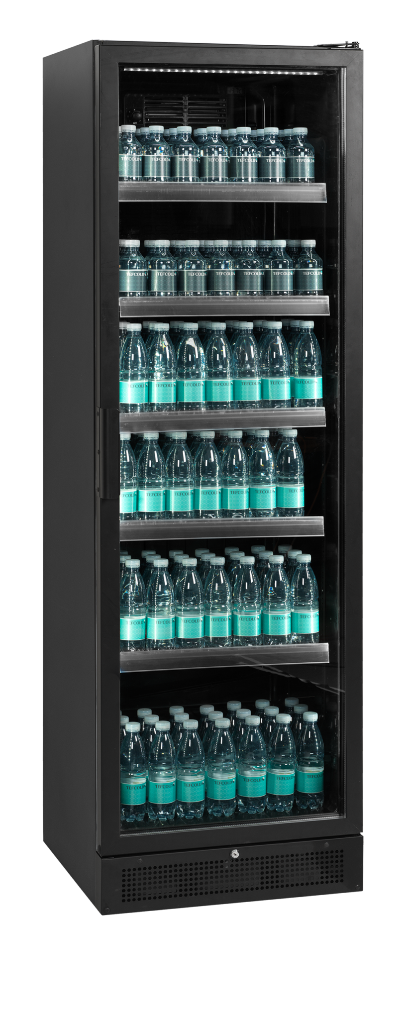 La gama SCU1425 de enfriadores de botellas lleva la refrigeración en expositor asequible a un nuevo nivel de calidad. Su exterior e interior negros le confieren un elegante toque. Este refrigerador cuenta con una puerta de cristal reversible de altura completa con marco de aluminio, estantes ajustables e iluminación LED interior para una presentación óptima del producto. Un sistema de refrigeración asistido por ventilador garantiza una refrigeración homogénea en todo el armario. También disponible como modelo con puerta de cristal sin marco.
