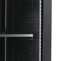 Diseño elegante|Excelente presentación del producto|Interior y exterior negro|Puerta de cristal extra alta|Puerta de cristal con bisagras, marco de aluminio|Luz vertical interna LED|Refrigeración asistida por ventilador