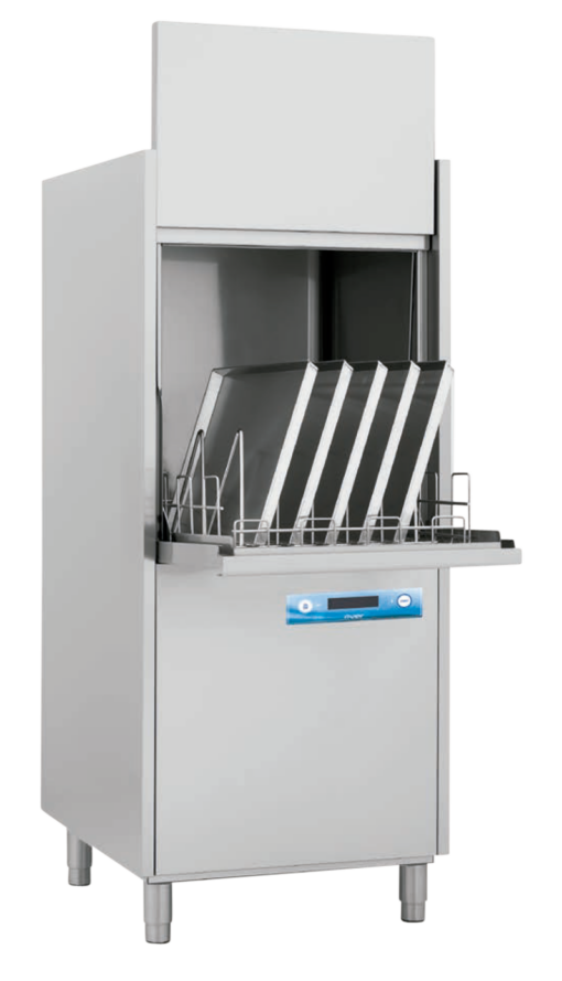 Lavaobjetos con puerta de doble pared y brazos de lavado y aclarado independiente.