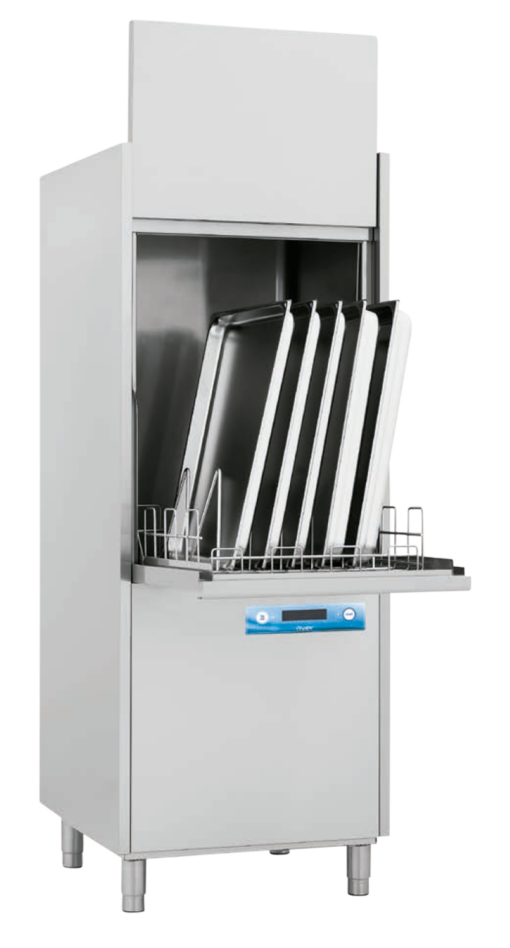 Lavaobjetos con puerta de doble pared y brazos de lavado y aclarado independiente.