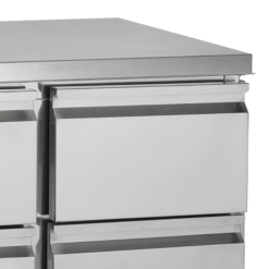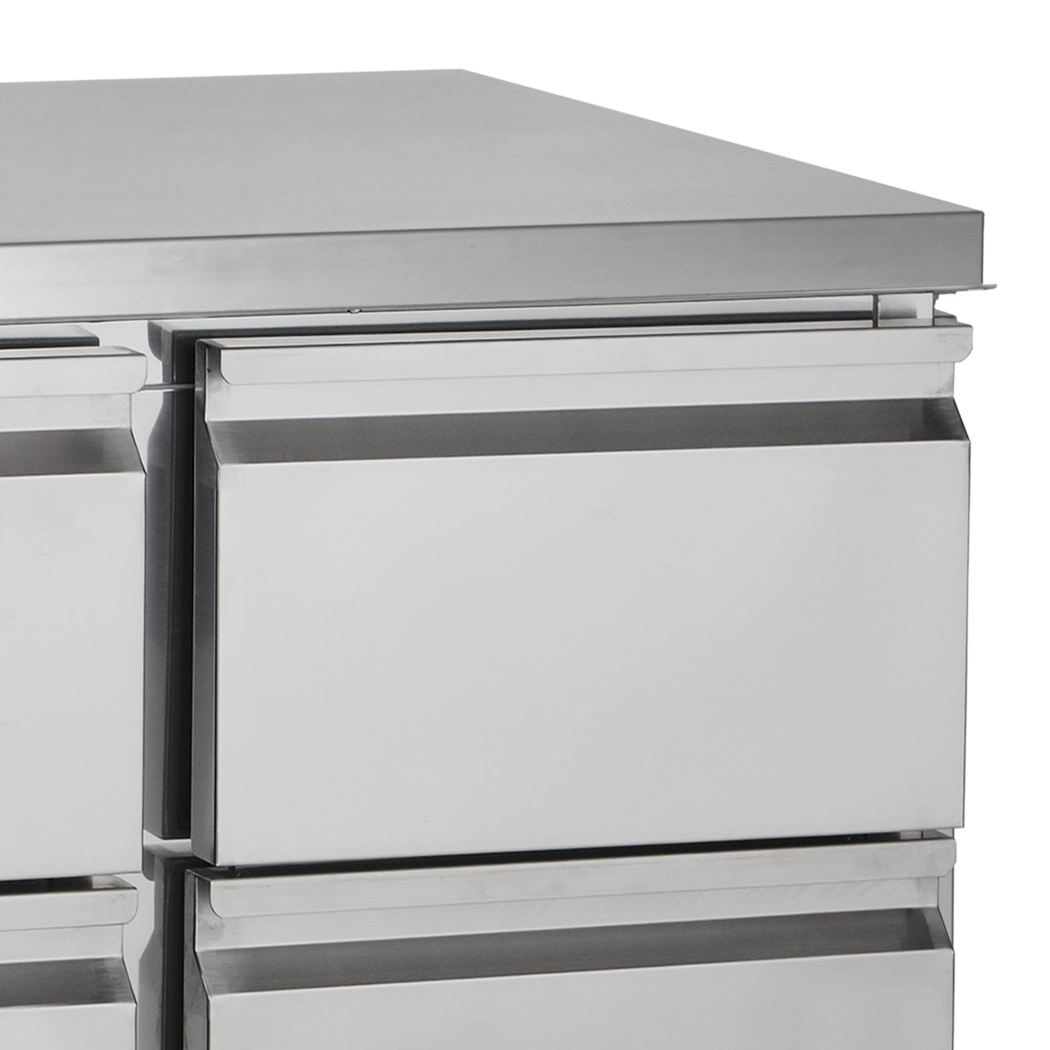 La gama SA de mesas frías Saladette es perfecta para entornos de cocinas muy concurridas con armarios de dimensiones Gastronorm GN1/1 y estantes ajustables. Si se prefiere, también es posible instalar cajones Gastronorm. Estas mesas frías están disponibles en varios tamaños, con encimera de mostrador o cubierta abierta apropiada para bandejas GN.
