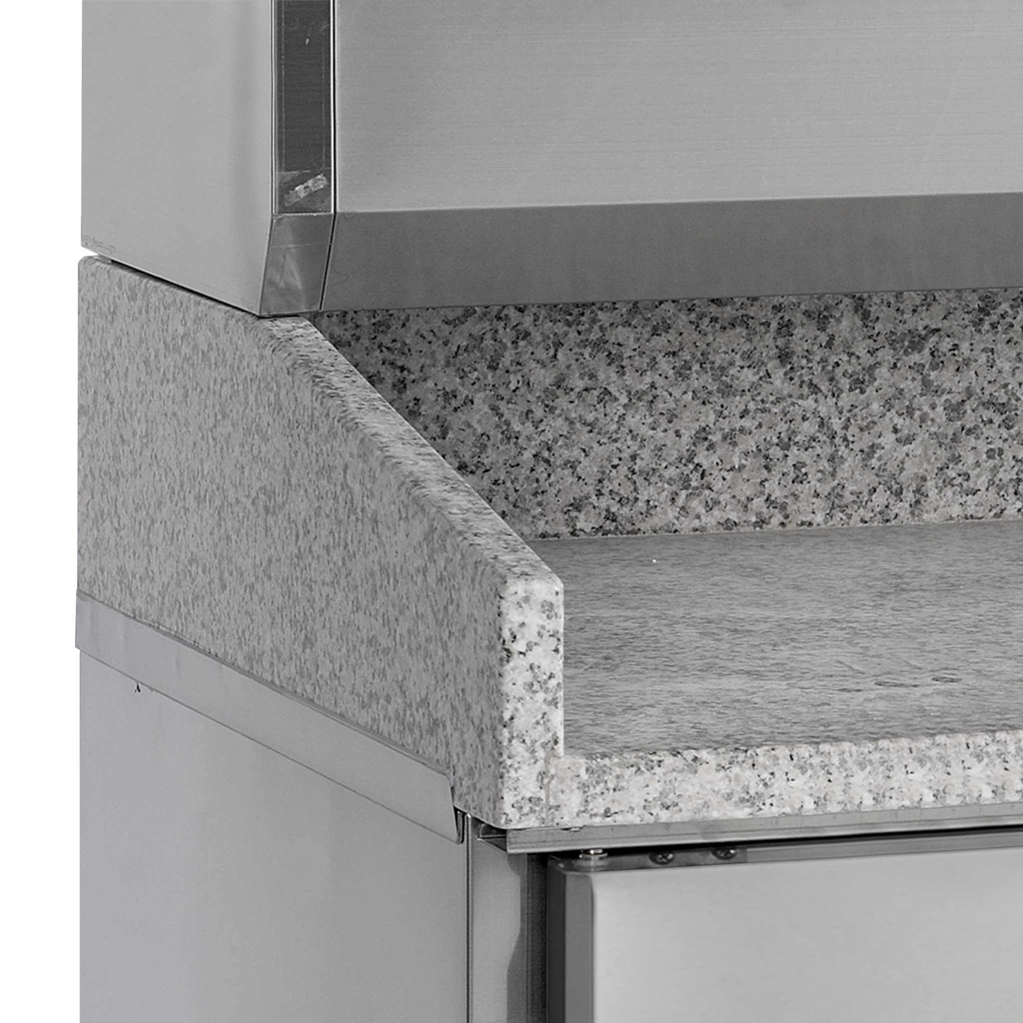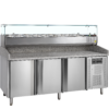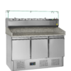 Acero inoxidable|Cajones a temperatura ambiente|Guías para 7 bandejas de pizza en cada puerta (400×600 mm)|Unidad de condimentos GVC38-200 para bandejas GN1/3|Encimera de granito|Refrigeración forzada|Descongelación automática|Puertas de cierre automático