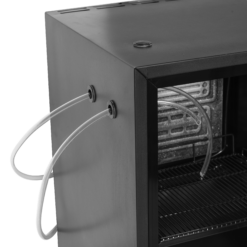 Ideal como refrigerador de leche para máquinas de café|Refrigerador de encimera con orificios, casquillos y conectores|6 orificios: 2 en la parte superior y 2 en cada lado|Puerta batiente de cristal|Patas regulables|Refrigeración asistida por ventilador|Luz interior LED|Tubos dispensadores no incluidos