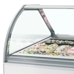 La gama Millennium LX de vitrinas expositoras de helado está disponible en tamaños aptos para 12 a 24 bandejas Napoli. Así, este equipo de alta gama con elegante cristal curvado es capaz de mostrar una amplia variedad de deliciosos sabores. El eficiente sistema de refrigeración asistido por ventilador garantiza una refrigeración homogénea de su gelato o crema de helado, con lo cual la temperatura se mantiene perfecta para formar las bolas.