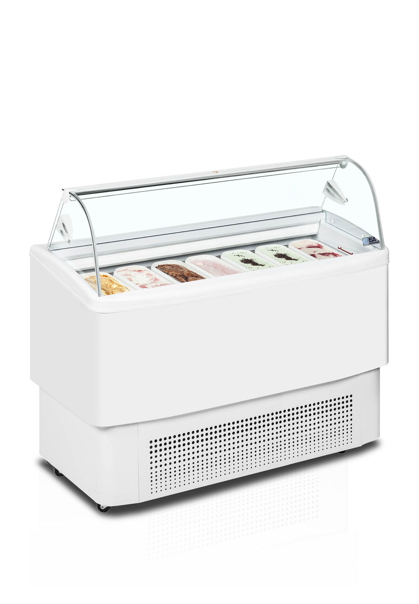 La gama Fiji de vitrinas de exposición de helado está disponible en tamaños aptos para 4, 6 o 7 bandejas Napoli. Con una profundidad de tan solo 630mm, este congelador es compacto e idóneo para espacios pequeños. Este expositor de helado está equipado con un sistema de refrigeración asistido por ventilador perfecto para mantener la calidad y consistencia de su crema de helado o gelato. Además, cuenta con ruedas giratorias para una fácil movilidad, iluminación LED interna y una cómoda puerta trasera abatible para servir.